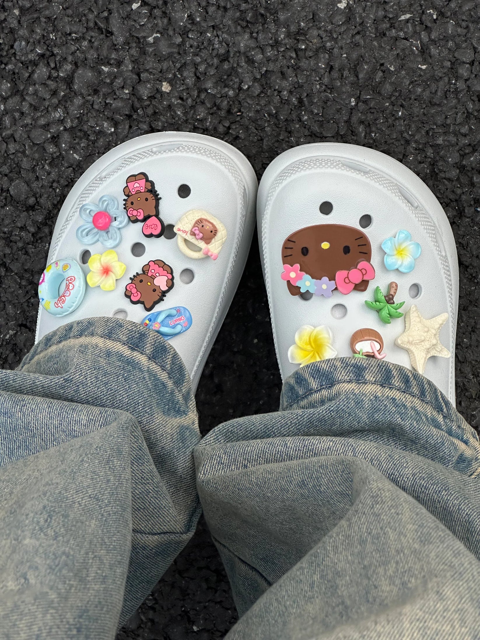 Add a cute and playful touch to your footwear with this Tan Hello Kitty Jibbitz Charms Pack. Featuring adorable Hello Kitty designs along with fun tropical elements like flowers, a palm tree, and beach-themed pieces, these charms are perfect for customizing your Crocs, clogs, slides, or even bags. Made from durable and lightweight material, they are easy to attach and remove, letting you switch up your style anytime. A must-have for Hello Kitty lovers who want to show off their personality in a fun and unique way.