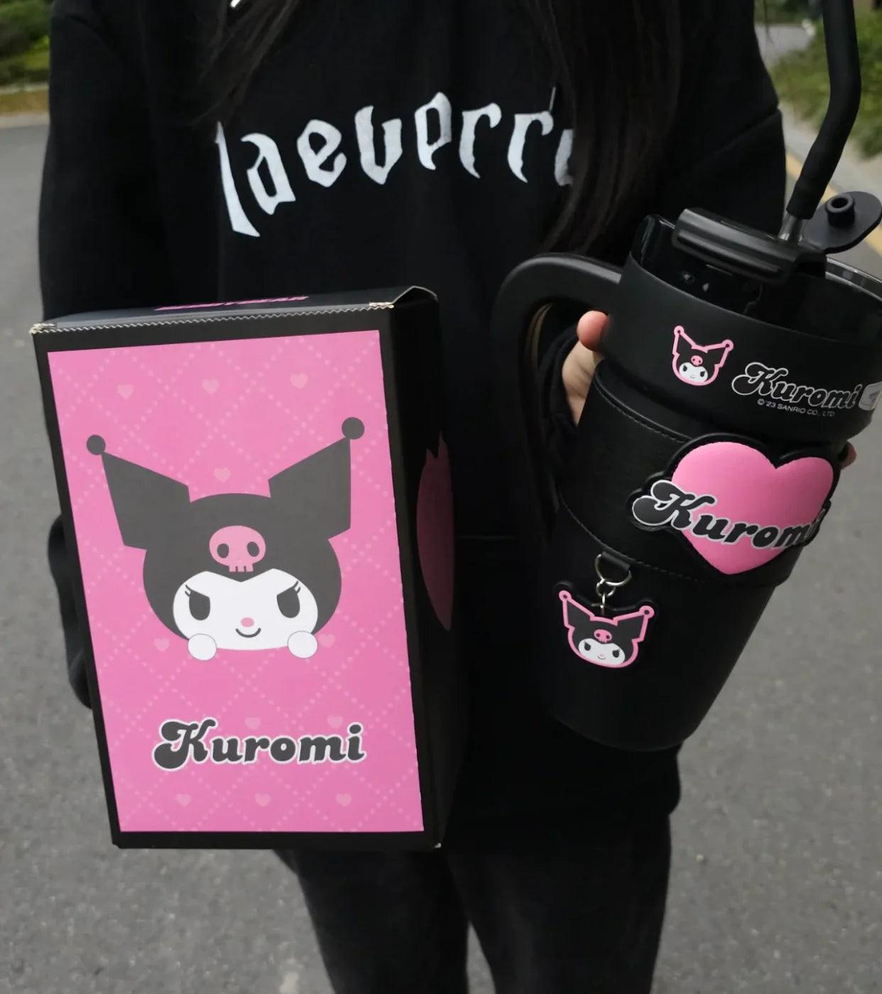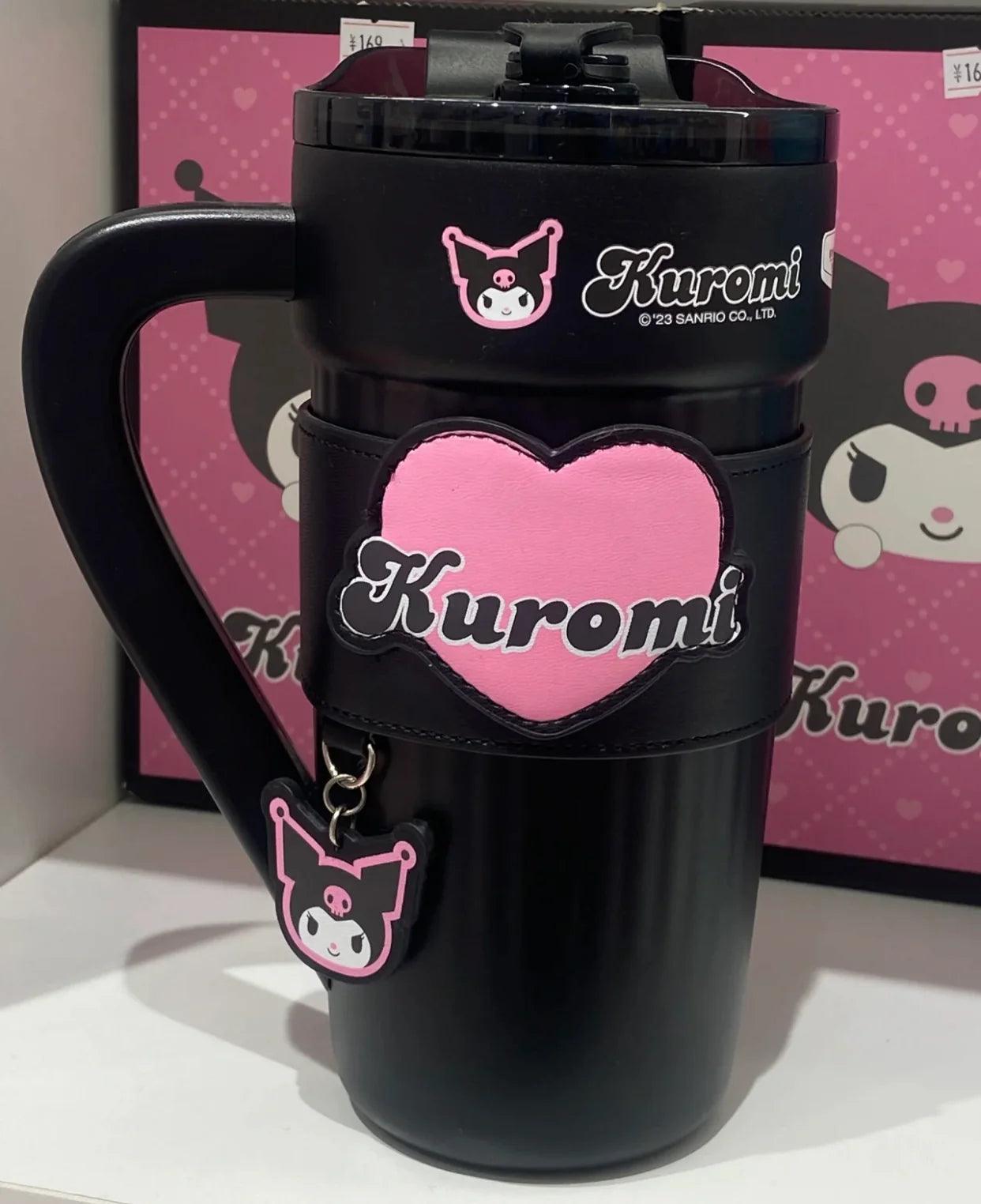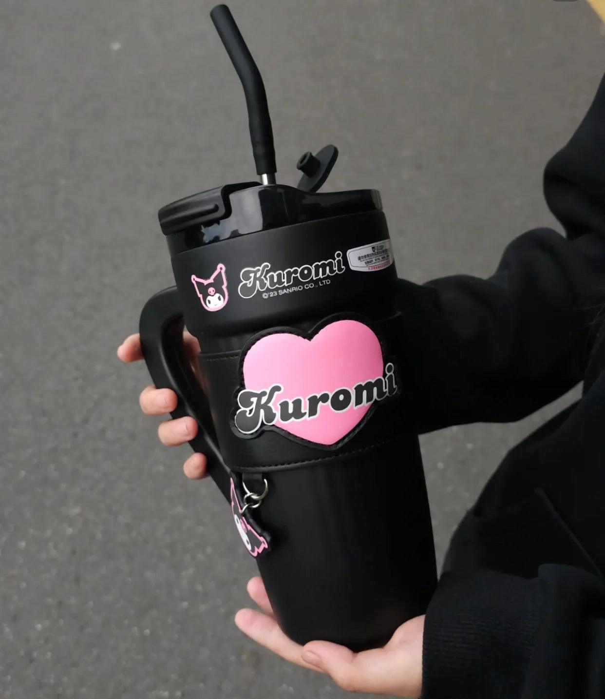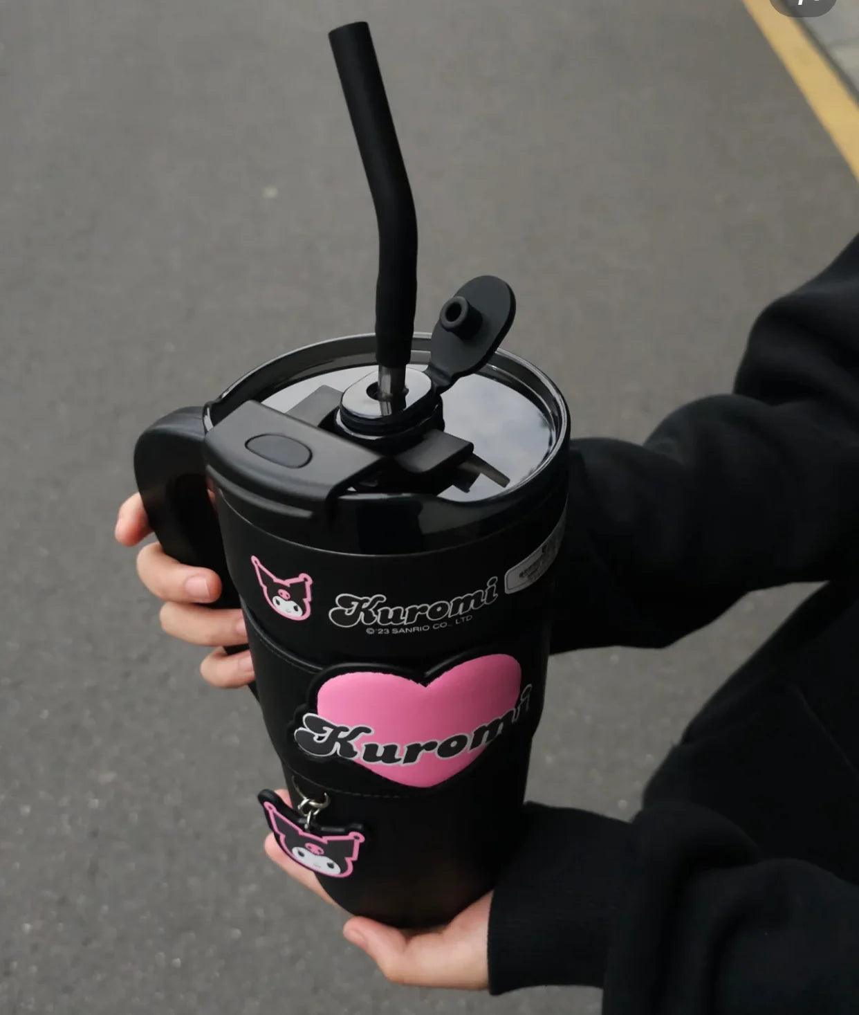 Introducing the Hello Kitty/Kuromi Insulated Travel Tumbler, designed for both convenience and style. This tumbler features a handle, carrier bag, stainless steel insulation, a straw lid, and a cupholder-friendly design. It effectively keeps beverages hot or cold, making it perfect for women's gym routines or travel. It also includes a removable sleeve for added comfort.