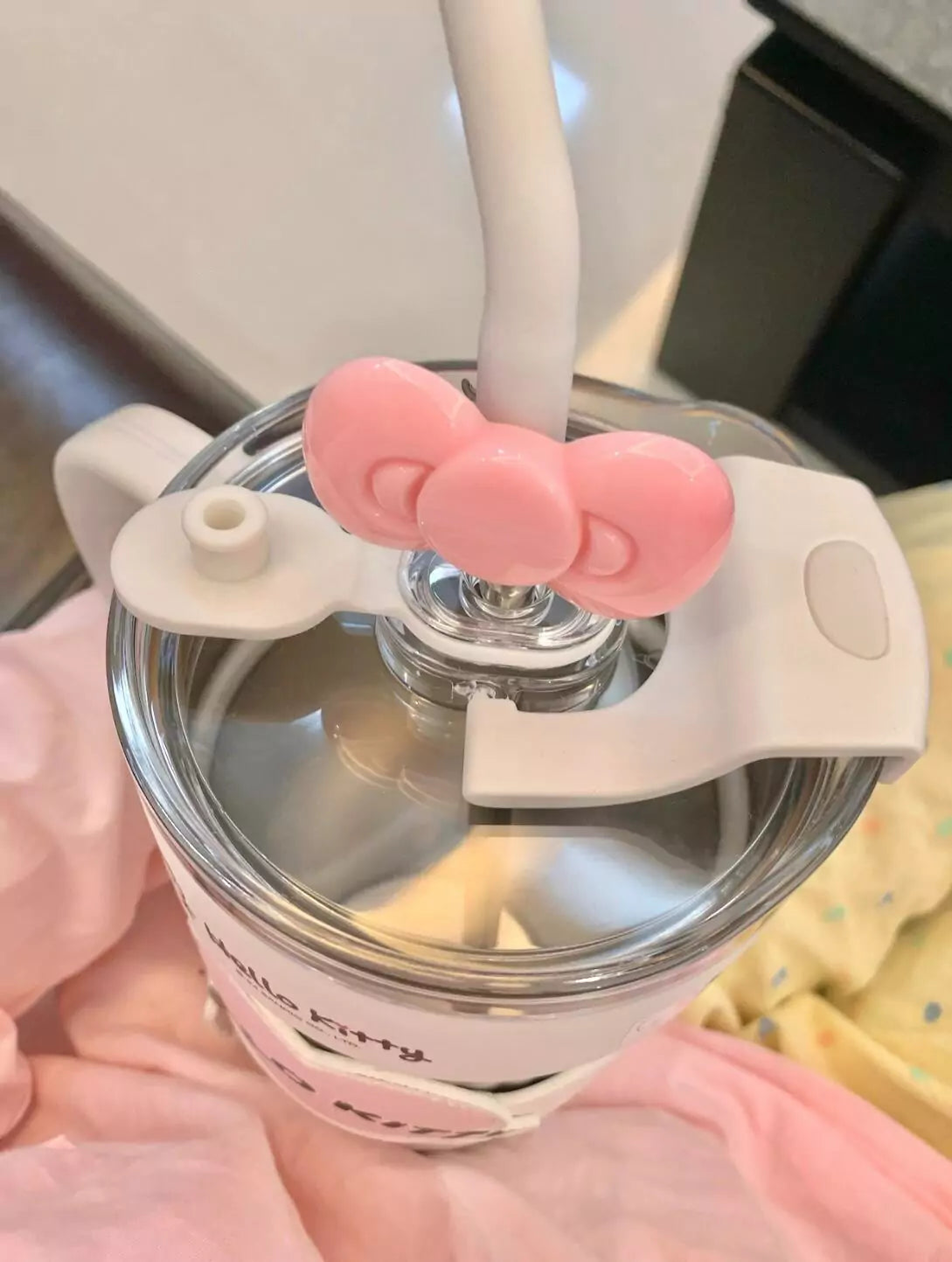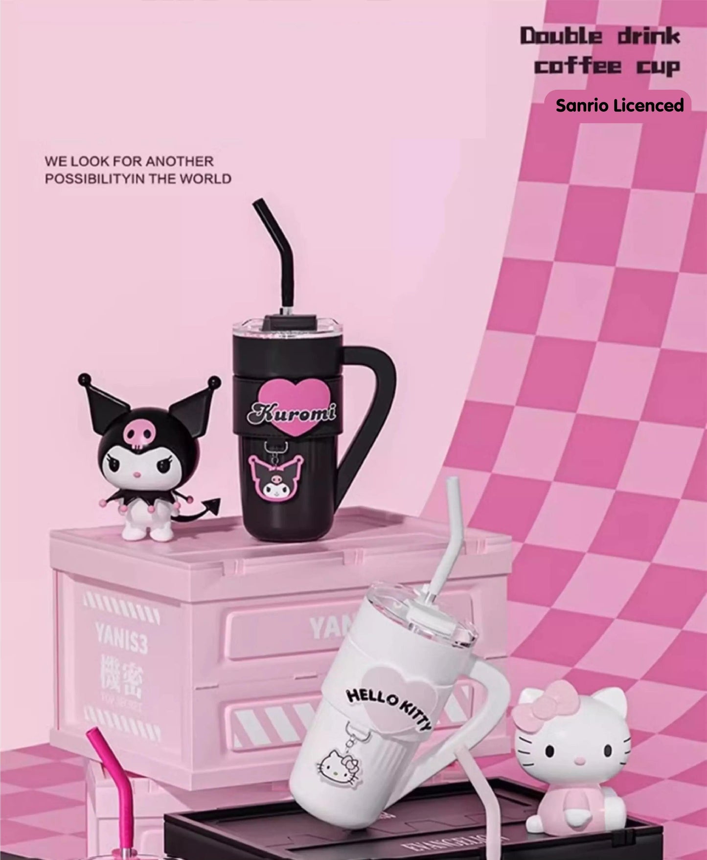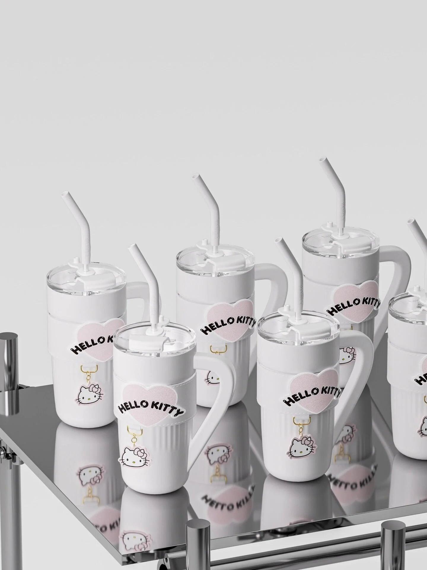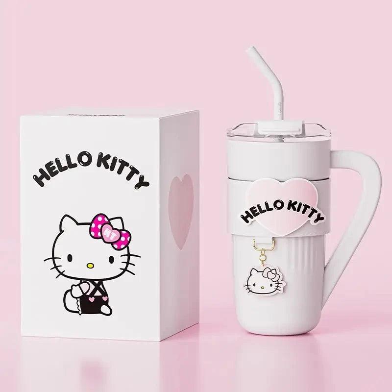 Introducing the Hello Kitty/Kuromi Insulated Travel Tumbler, designed for both convenience and style. This tumbler features a handle, carrier bag, stainless steel insulation, a straw lid, and a cupholder-friendly design. It effectively keeps beverages hot or cold, making it perfect for women's gym routines or travel. It also includes a removable sleeve for added comfort.