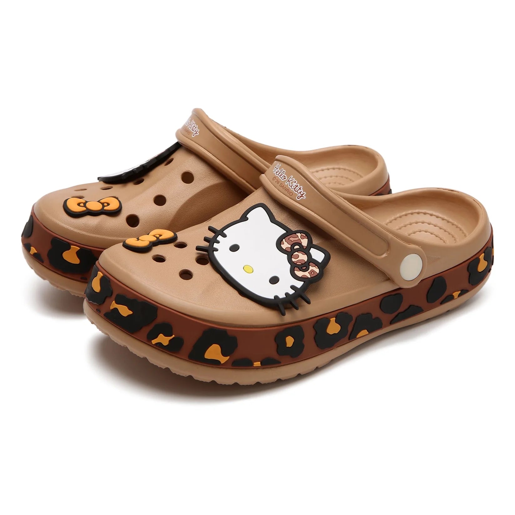 Step into bold kawaii style with these Hello Kitty Leopard Print Clogs! They feature a playful leopard pattern with the iconic Hello Kitty charm, blending cute and trendy for everyday wear. Lightweight, breathable, water-friendly and easy to clean, they’re comfortable for home, errands, the beach or casual outings. The slip-on design and cushioned sole offer all-day comfort, making them a must-have for Hello Kitty fans.