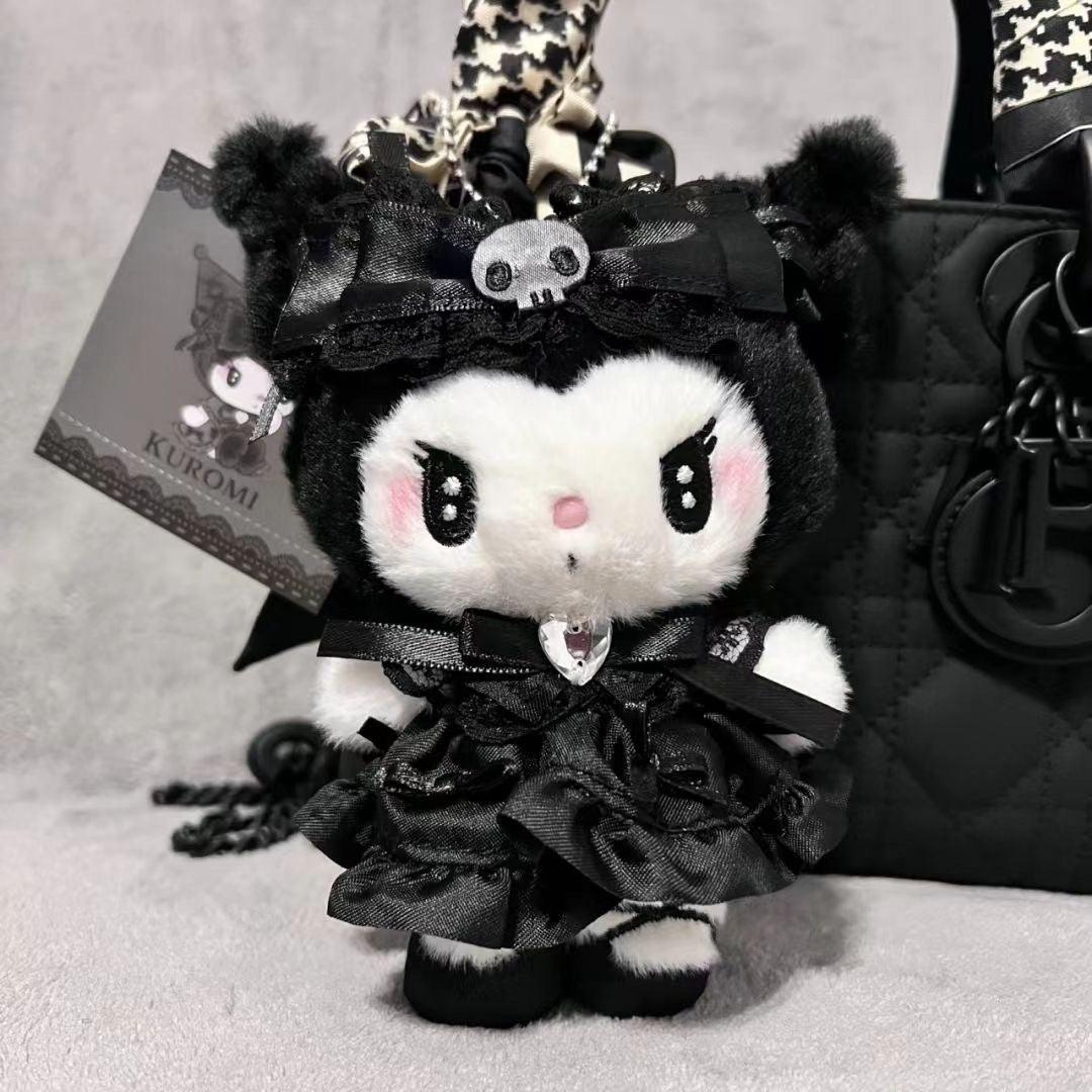 The Gothic Lace Kuromi/ My Melody Plush Keychain is a beautifully crafted 6-inch plush featuring My Melody and Kuromi in a midnight Gothic Lolita style. This high-quality plush showcases intricate Lolita details with delicate lace accents and adorable wings on the back, perfect for adding a unique touch to any collection!
