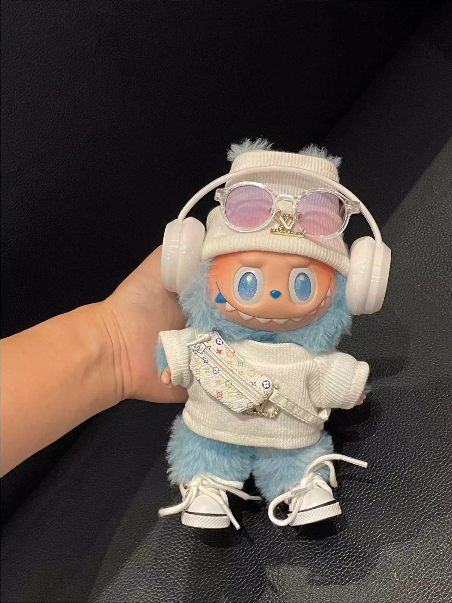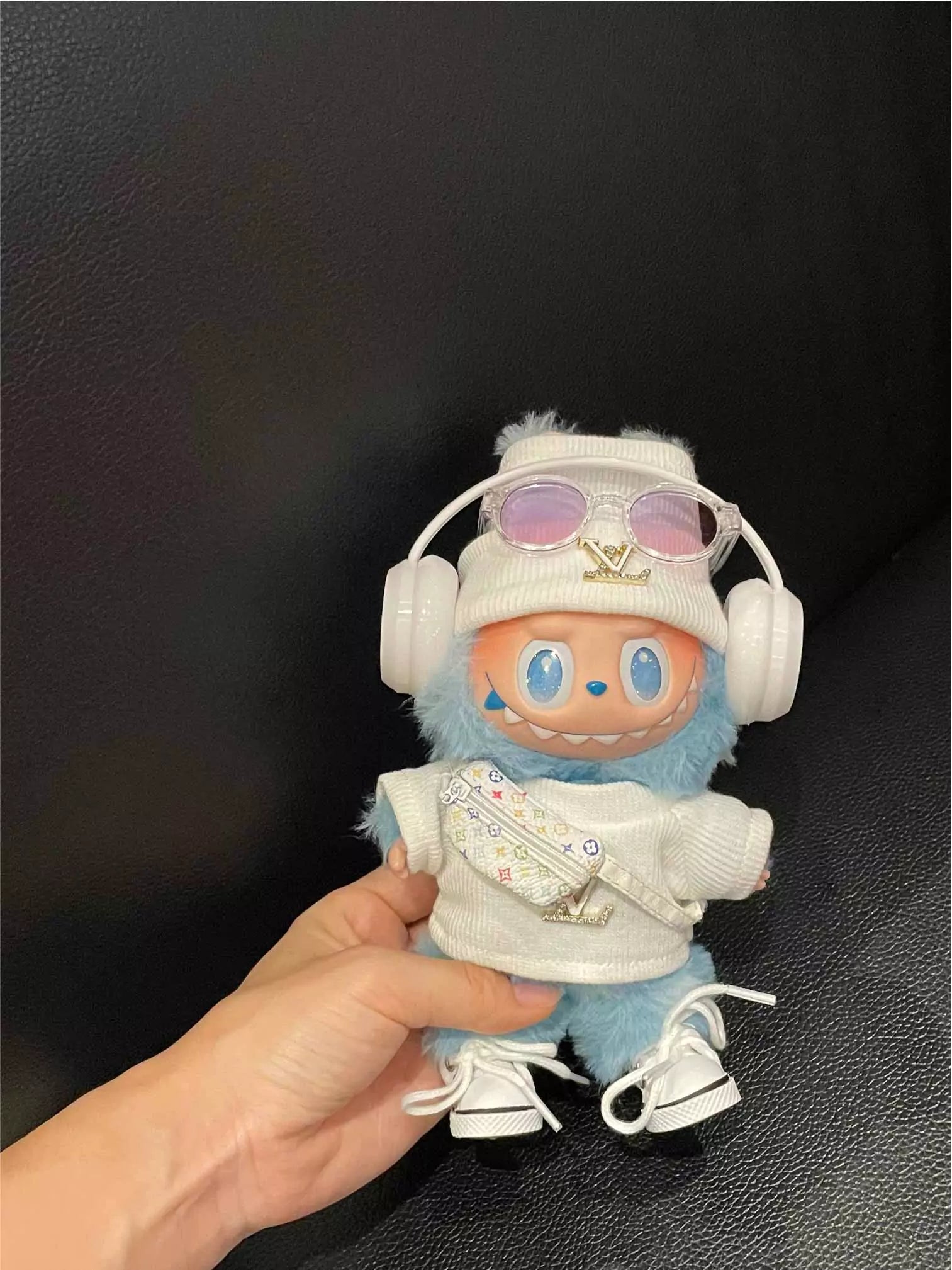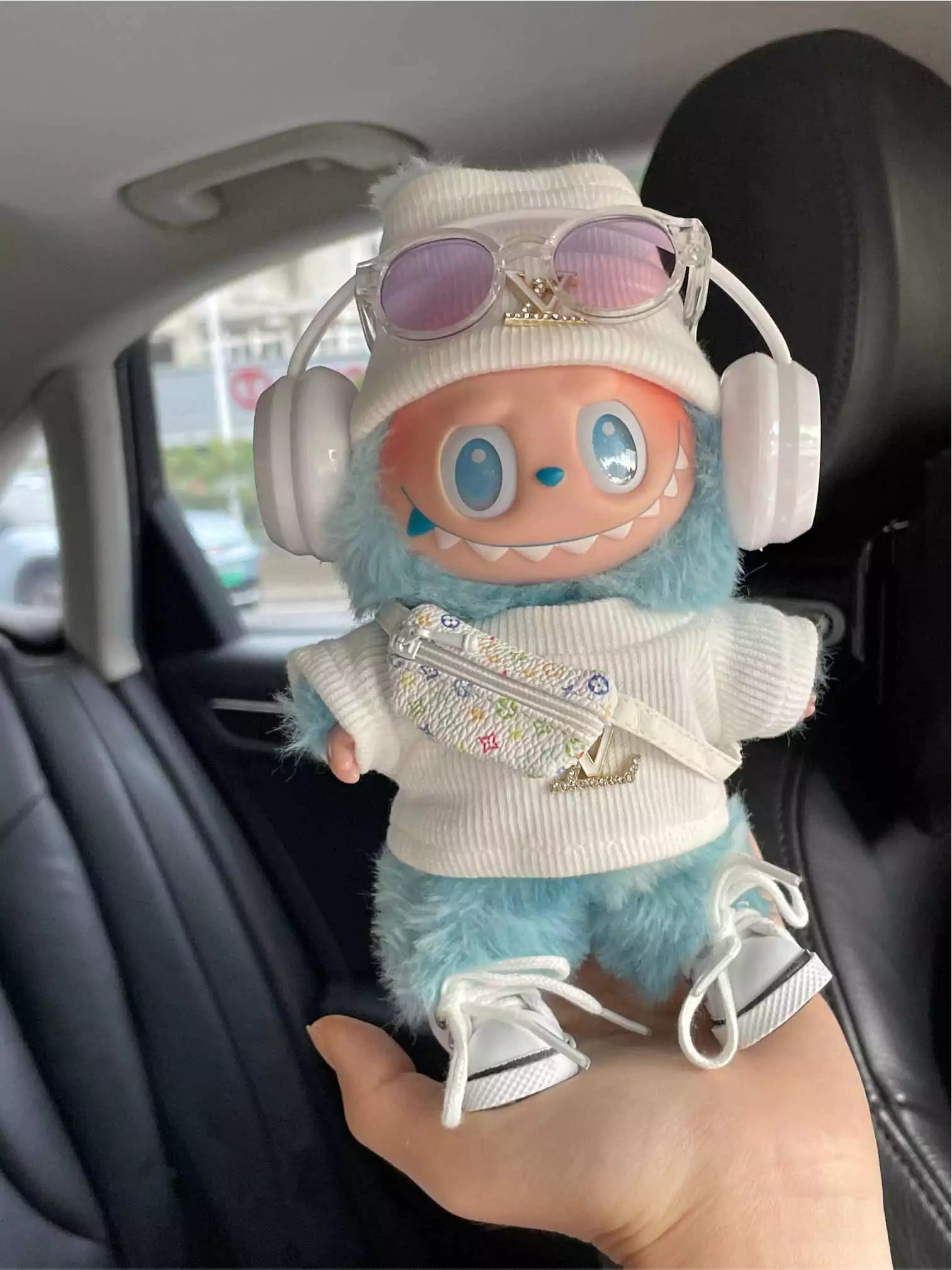 Dress your Labubu in ultimate street-chic with this luxury-inspired white outfit set. Featuring a ribbed knit beanie, matching sweatshirt, jogger pants, and monogram sneakers, this stylish set is completed with a coordinating crossbody bag. Perfect for giving your Labubu a high-fashion makeover, the pieces are crafted with attention to detail for a sleek and trendy look.