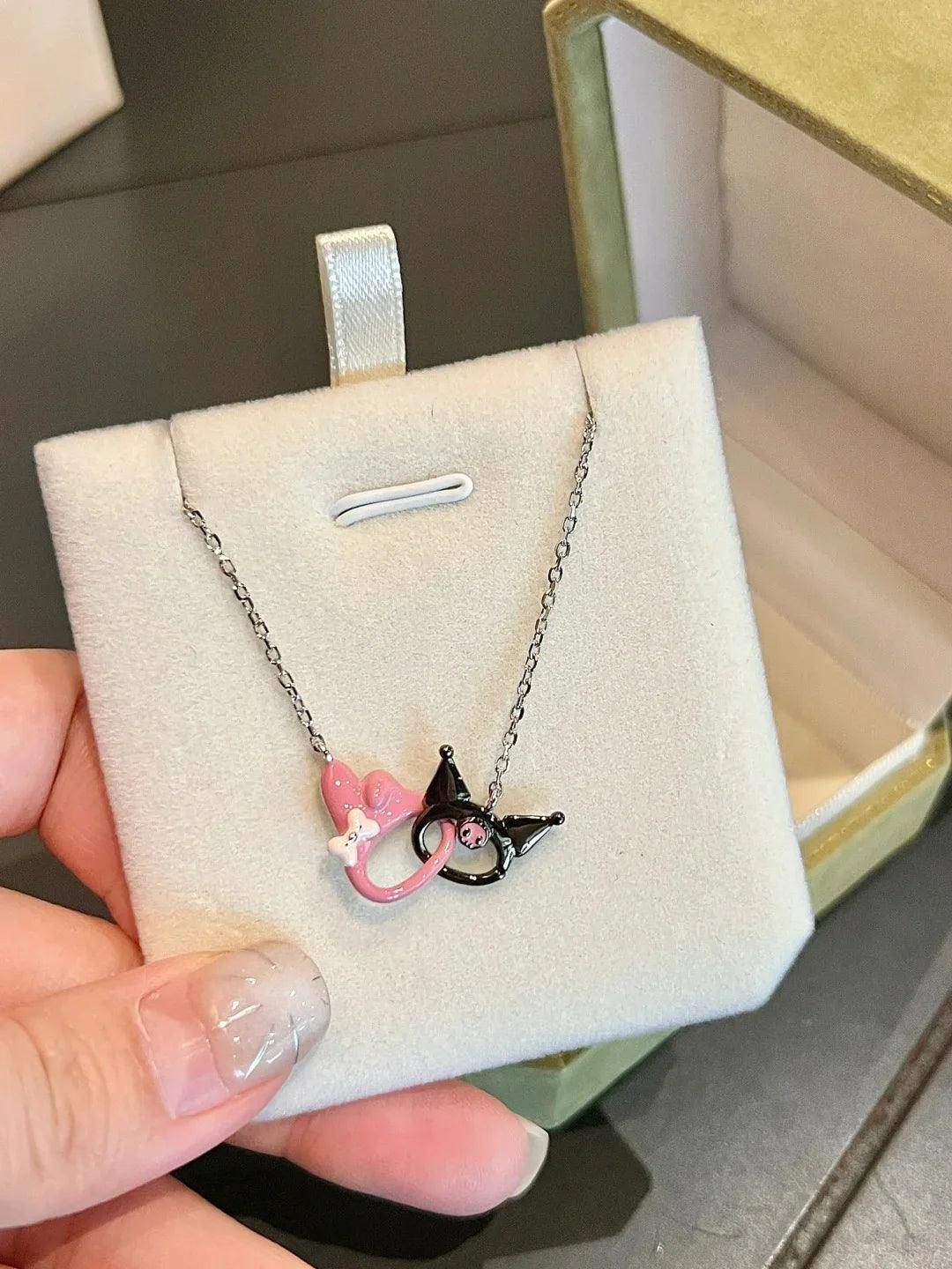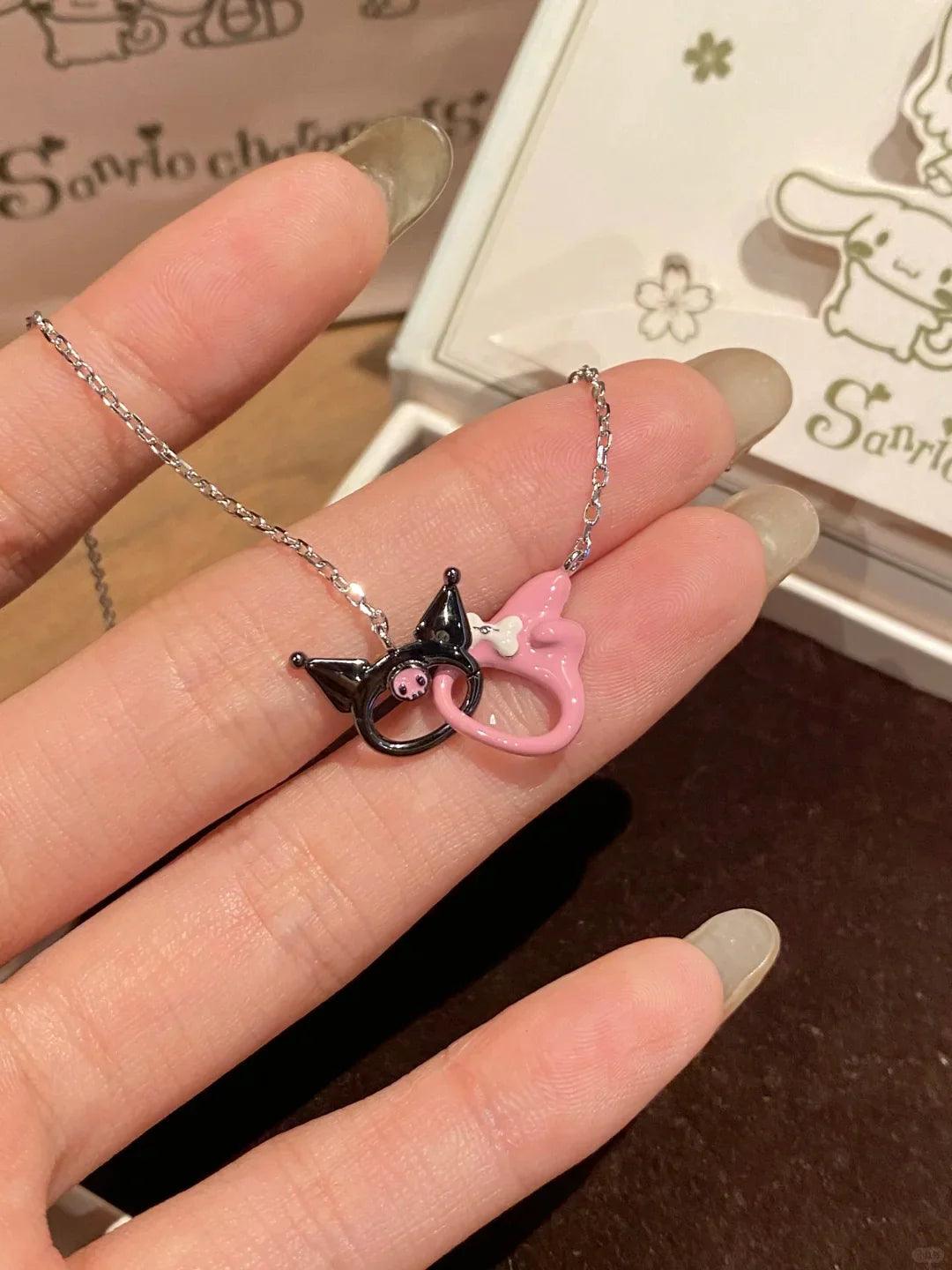 A stylish necklace featuring Kuromi and My Melody rings that hook together, combining charm and elegance in one unique accessory.