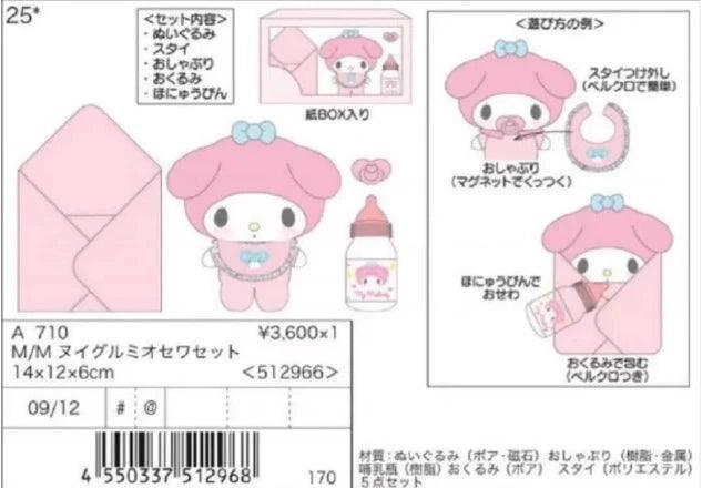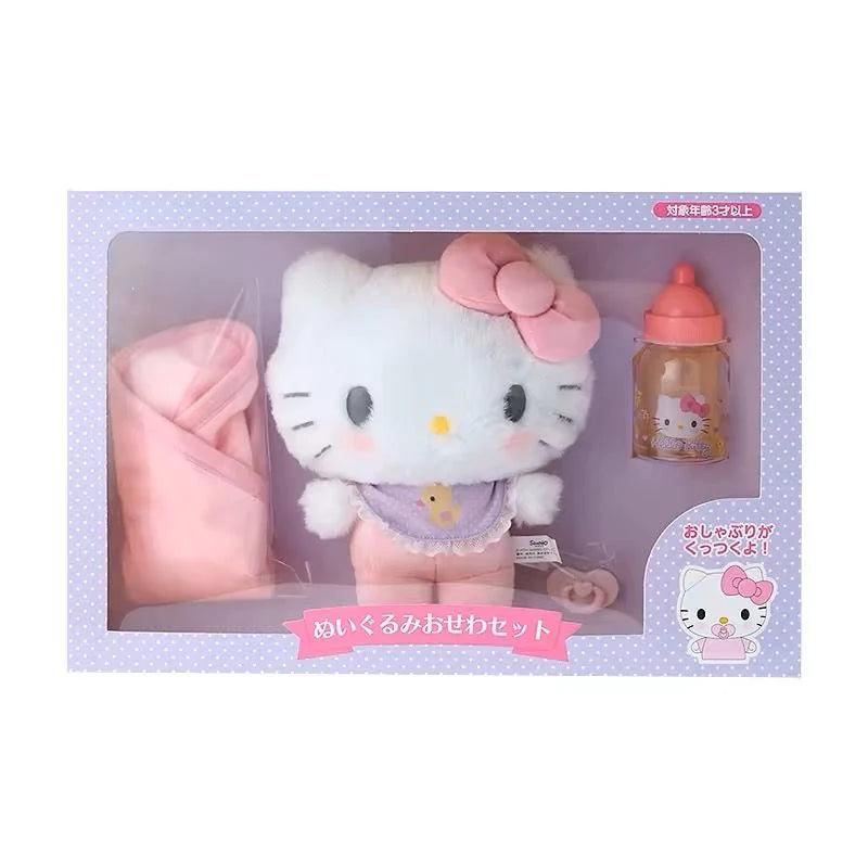 The Sanrio Baby Plush Toy Set features an adorable Sanrio plush designed for nurturing play. This set includes a baby bottle, pacifier (with a magnetic attachment), and a soft swaddle blanket, allowing kids to feed, soothe, and tuck their plush into bed. Perfect for interactive and imaginative play, it's a must-have for Sanrio fans!