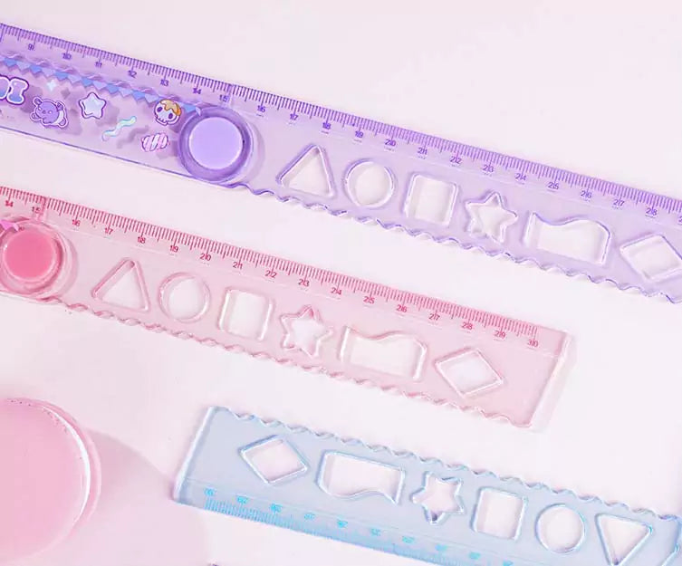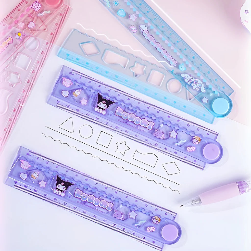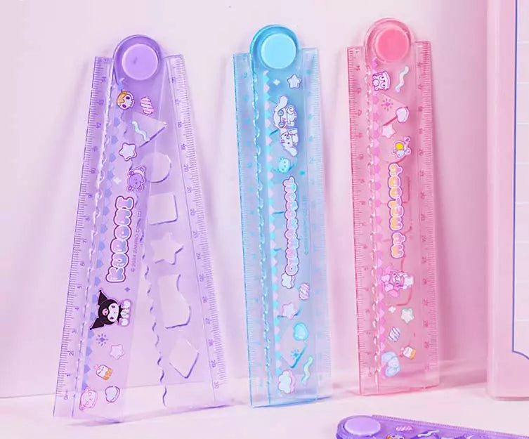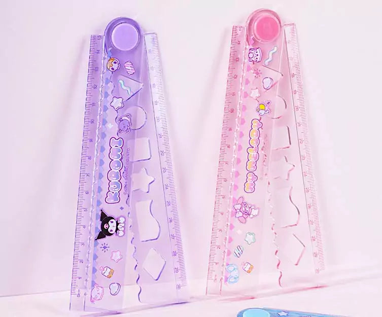 Upgrade your stationery with this foldable and expandable Sanrio ruler. Made from durable, flexible PS material, it features charming Sanrio character designs and expands from 15 cm to 30 cm. Includes built-in stencils with geometric shapes, a wavy edge for creative lines, and a transparent body for accurate markings. Perfect for school, journaling, or creative projects.