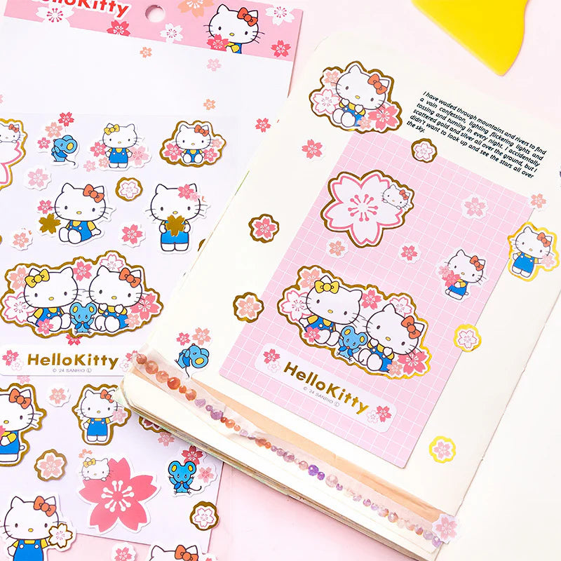 Add a touch of elegance to your stationery with these sakura-themed Sanrio stickers. Choose from 6 adorable characters or collect the full set. Each sheet features delicate cherry blossom designs with gold foil accents on durable, glossy PET material—perfect for journals, planners, scrapbooks, and more.