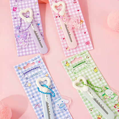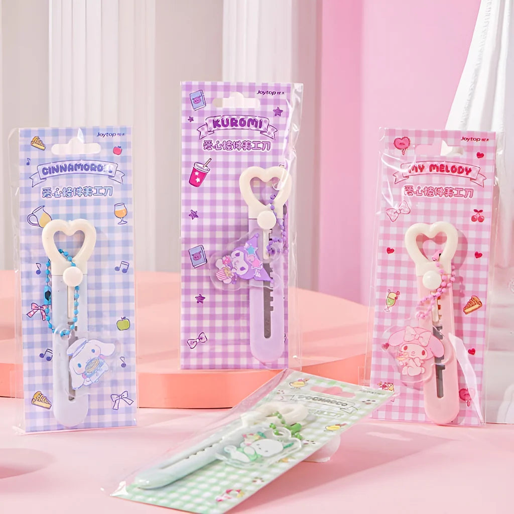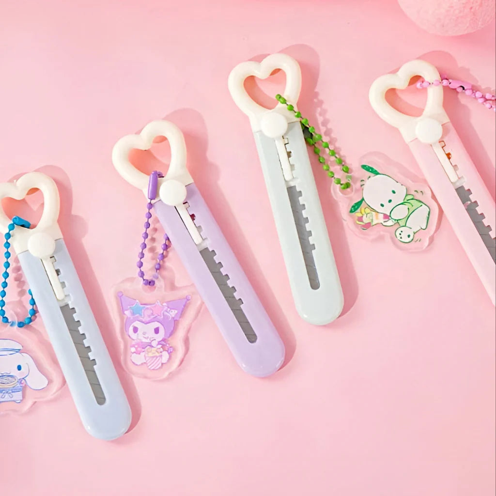 This compact and stylish paper cutter features a safe sliding blade, pastel design, and a matching Sanrio character charm. Perfect for journaling, crafting, and travel.