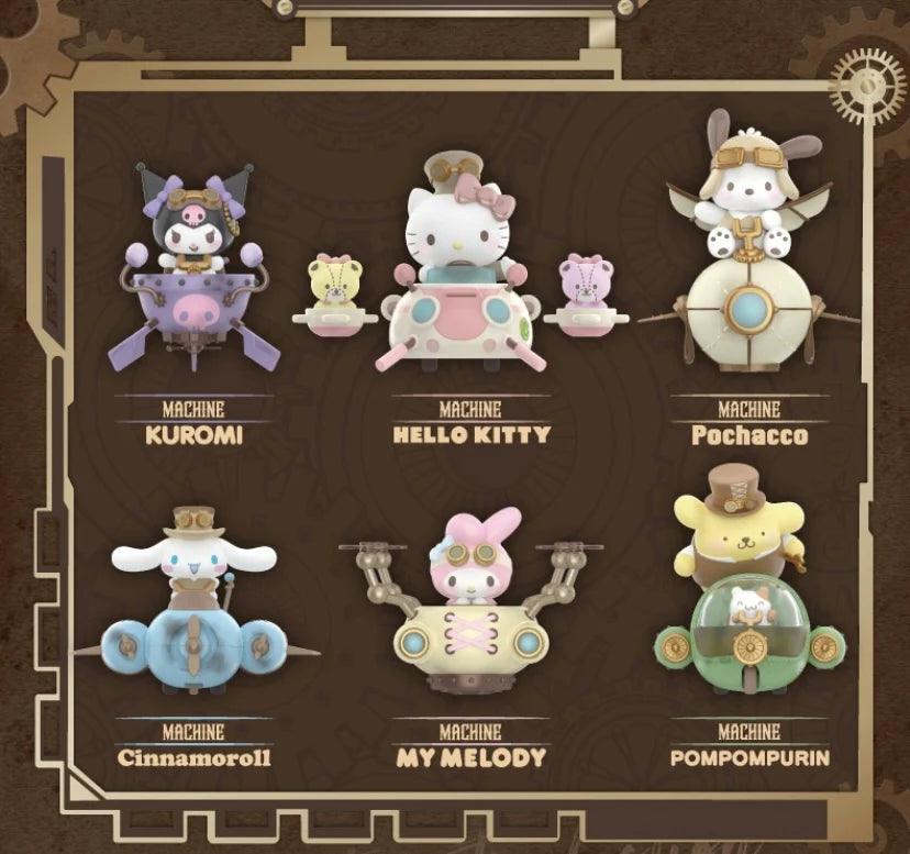 Explore Sanrio with a steampunk twist! This unique collection features six beloved characters, each in a beautifully crafted steampunk vehicle. With no secret chaser, every box guarantees one figure. A perfect vintage-inspired addition for any Sanrio fan or collector!